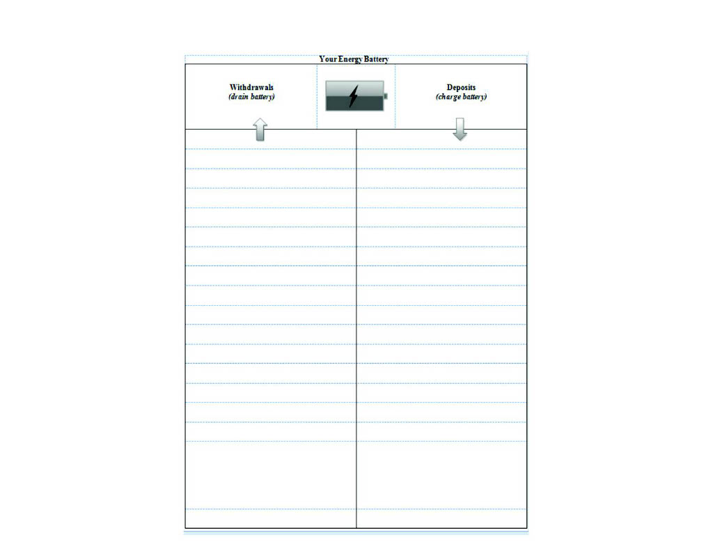 Please download and fill out the Energy Battery worksheet provided in the link provided here: On the depletion side of the worksheet, please list any stressors that drain you. On the recharging side, list those things that decrease your stress. This exercise should take about 10 minutes to complete. Afterwards, you may wish to reflect on your responses. For example, were there more depletions than recharges? Did the recharges seem to really revitalize you? Did you struggle to recall experiences that recharge you? Were recharges focused on doing something for someone else, rather than yourself?