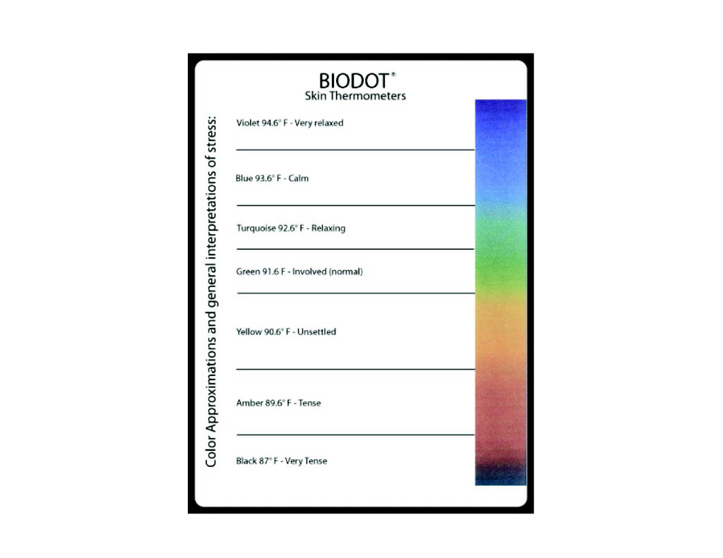 Another tool to help us monitor and build awareness of our stress or anxiety response is the biofeedback measurement called biodot. Biodots are inexpensive dots made up of liquid crystals that change color in response to changes in temperature. Using biodots can help to build awareness of how you feel, physically and emotionally, when you're relaxed and when you're tense.